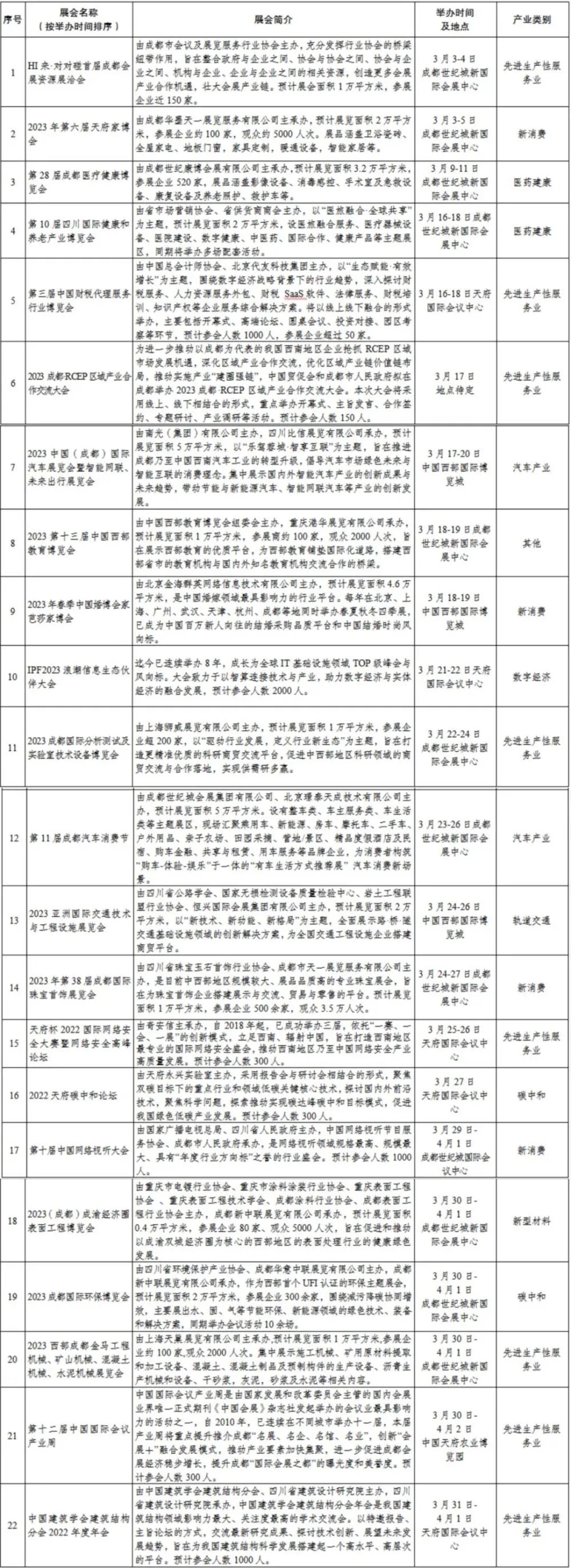 據了解,這些會展活動中,涉及軌道交通1個、汽車產業2個、新型材料1個、數字經濟1個、先進生產性服務業8個、新消費產業4個、醫藥健康2個、碳中和2個、其他1個。其中,在先進生產性服務業中,由《中國會展》雜志社主辦的第十二屆中國國際會議產業周將在成都市新津區天府農業博覽園舉辦。