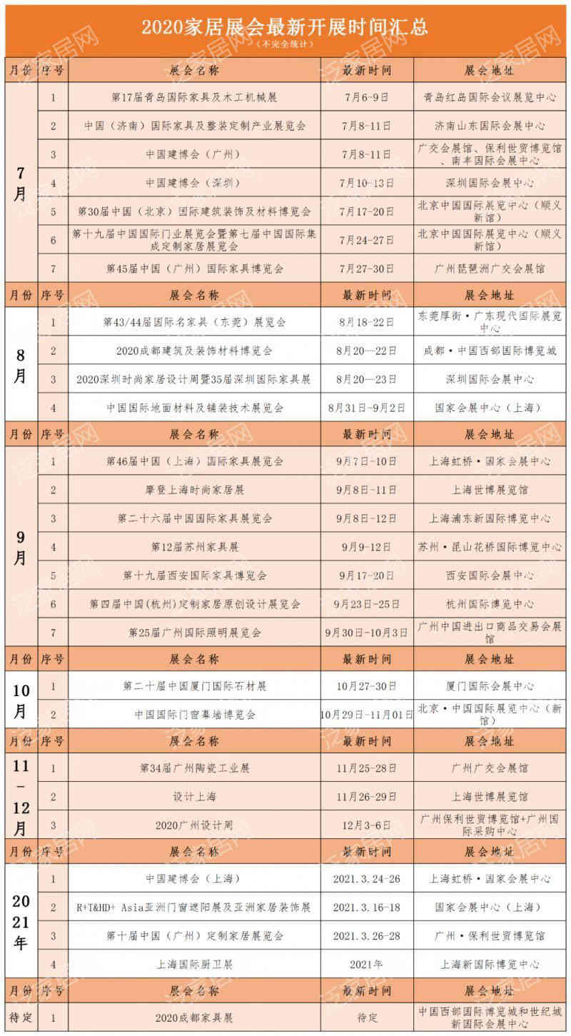 目前,2020成都國(guó)際家具展展期待定,而中國(guó)建博會(huì)(上海)、R+T&HD+ Asia亞洲門窗遮陽(yáng)展及亞洲家居裝飾展、中國(guó)(廣州)定制家居展覽會(huì)、上海國(guó)際廚衛(wèi)展已明確公布延期至2021年開展。以下是7月至12月已確定展期的部分展會(huì),感興趣的朋友們可以一鍵搜藏。